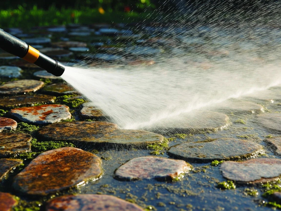 Czyszczenie kamiennego dywanu: myjka ciśnieniowa, glony, mech — bez wyrywania kruszywa