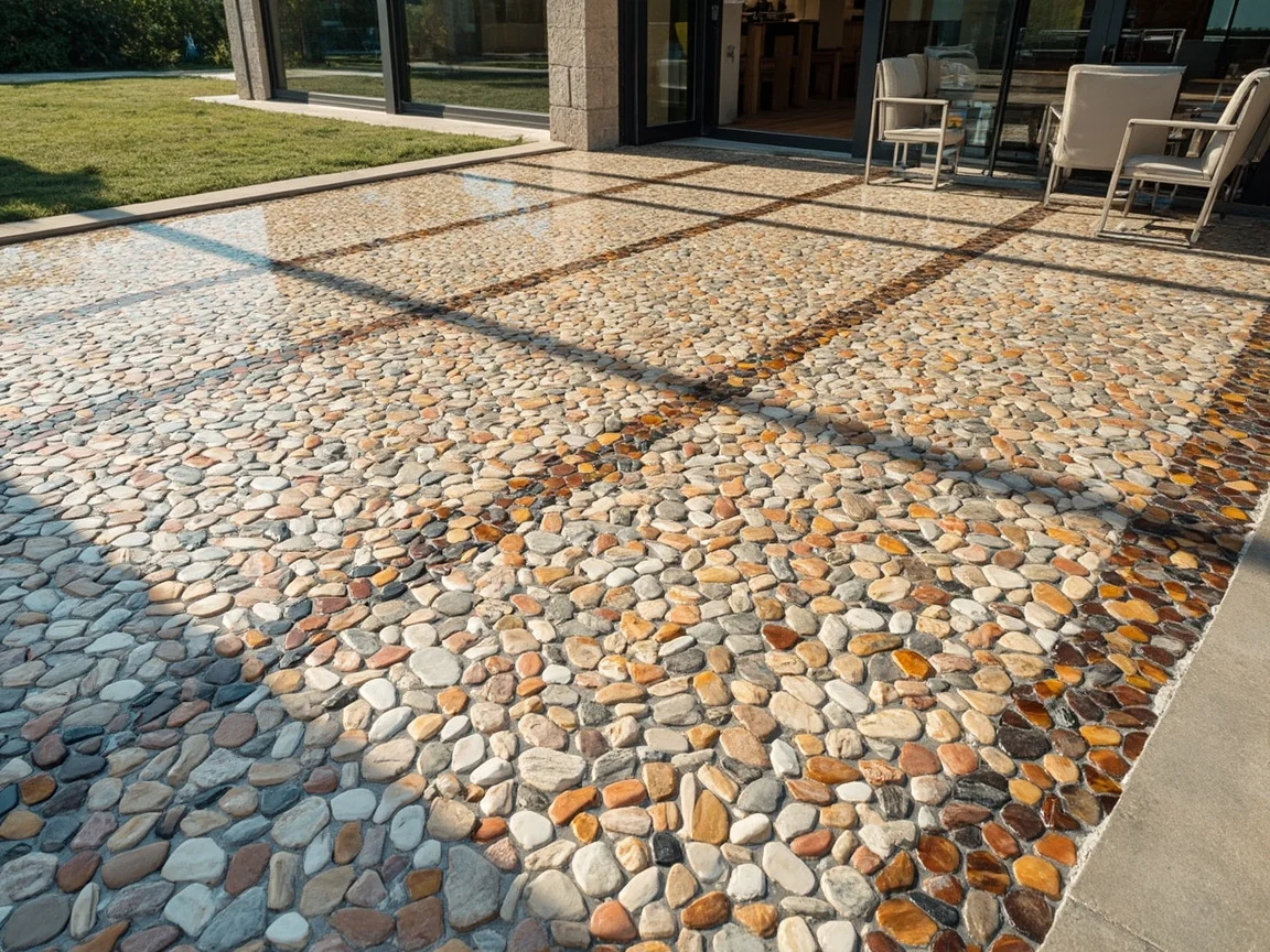 Efekt wizualny potrafi zapierać dech w piersiach. Powierzchnia przypomina drobnoziarnisty granit lub eleganckie lastryko, ale z dużo gładszą, zunifikowaną fakturą. Drobne kamyczki – najczęściej w odcieniach bieli, szarości, beżu lub barwione – leżą idealnie płasko, a żywica wypełnia najmniejsze szczeliny, tworząc gładką, ale antypoślizgową płaszczyznę. To nie jest chropowata, kalecząca stopę nawierzchnia. To wyrafinowana, jednolita tafla, gdzie piękno naturalnego kamienia łączy się z perfekcją nowoczesnej powłoki.
